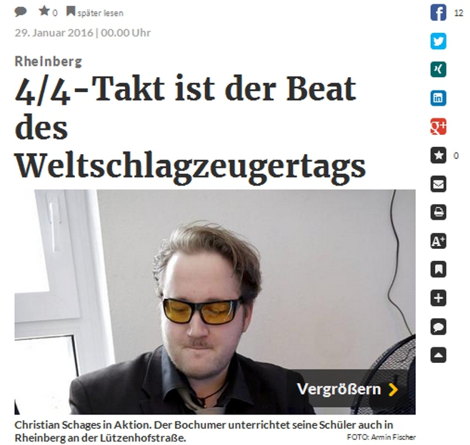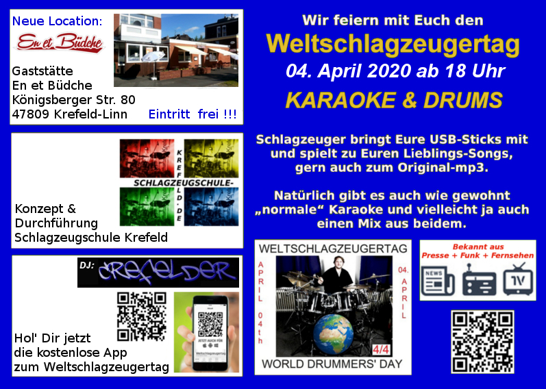 Pressemitteilung zum Weltschlagzeugertag 2020 Liebe Medien-/Partner, am Samstag, den 04. April ist Weltschlagzeugertag! Es wäre schön, wenn Sie unser nichtkommerzielles Event/Projekt, den "Weltschlagzeugertag" (WST), in Ihrem Medium nennen, beschreiben und/oder einen entsprechenden Veranstaltungshinweis veröffentlichen könnten. Alternativ oder zudem ein Posting auf Facebook wäre ebenfalls nett. Im Vorfeld schon einmal vielen Dank. Hier nun alle weiterführenden Informationen: Wir feiern den Weltschlagzeugertag 2020. Der durch Christian Schages, Inhaber der Schlagzeugschule Krefeld und der Schlagzeugschule Rheinberg, ins Leben gerufene “Weltschlagzeugertag/World Drummers‘ Day“ findet jährlich am 04. April statt. Dieses Jahr feiern wir ihn mit einem Event in der “Gaststätte En et Büdche“ in Krefeld-Linn. Aber wir freuen uns auch über Leute, die in ihrem Hemiatort ebenfalls ein Event oder eine Aktion zu unserem Ehrentag starten möchten. Hierunterstehend finden Sie noch eine genaue Beschreibung des Events. Über eine Berichterstattung und/oder einen Veranstaltungshinweis im Vorfeld würde ich mich natürlich sehr freuen. Gerne lade ich Sie hiermit auch ein, der Veranstaltung beizuwohnen. Event-Beschreibung: Weltschlagzeugertag 2020 Karaoke mit und ohne Schlagzeug – in Neuer Location! Weltschlagzeugertag 2020– Karaoke mit und ohne Schlagzeug in Krefeld. Wie bereits in den letzten Jahren möchte Christian Schages, Inhaber der Schlagzeugschule Krefeld, den von ihm ins Leben gerufenen Weltschlagzeugertag mit Euch, wie es in den letzten Jahren bereits Tradition geworden ist, zusammen feiern. Dieses Mal findet das Event in der „Gaststätte En et Büdche“, Königsberger Str. 80, in 47809 Krefeld statt. Ziel dieser Veranstaltung ist es zunächst Likes, also Unterstützer bei Facebook zu akquirieren, um somit diesen Ehrentag für Schlagzeuger, Trommler und Percussionisten jährlich am 04. April zu etablieren und natürlich diesen Tag gebührend zu feiern. Schlagzeuger können ihre Lieblingslieder als MP3 auf einem USB-Stick mitbringen und dazu spielen. Eingeladen sind natürlich auch alle anderen Musiker, Nichtmusiker, aber auch besonders möglichst viele Sänger und Sängerinnen mitzumachen, denn es werden über 35.000 Karaoke-Titel zum Mitsingen und Mittrommeln für Euch bereitgestellt. Einlass 18 Uhr, der Eintritt ist frei! Für Rückfragen und Interviews stehe ich gerne zur Verfügung. Hier finden Sie den Link zum Event-Flyer: http://weltschlagzeugertag.de/german/images/weltschlagzeugertag2020.jpg Mit groovigen Grüßen www.facebook.com/weltschlagzeugertag Der Weltschlagzeugertag ist übrigens auch seit ein paar Jahren auf Wikipedia zu finden. |