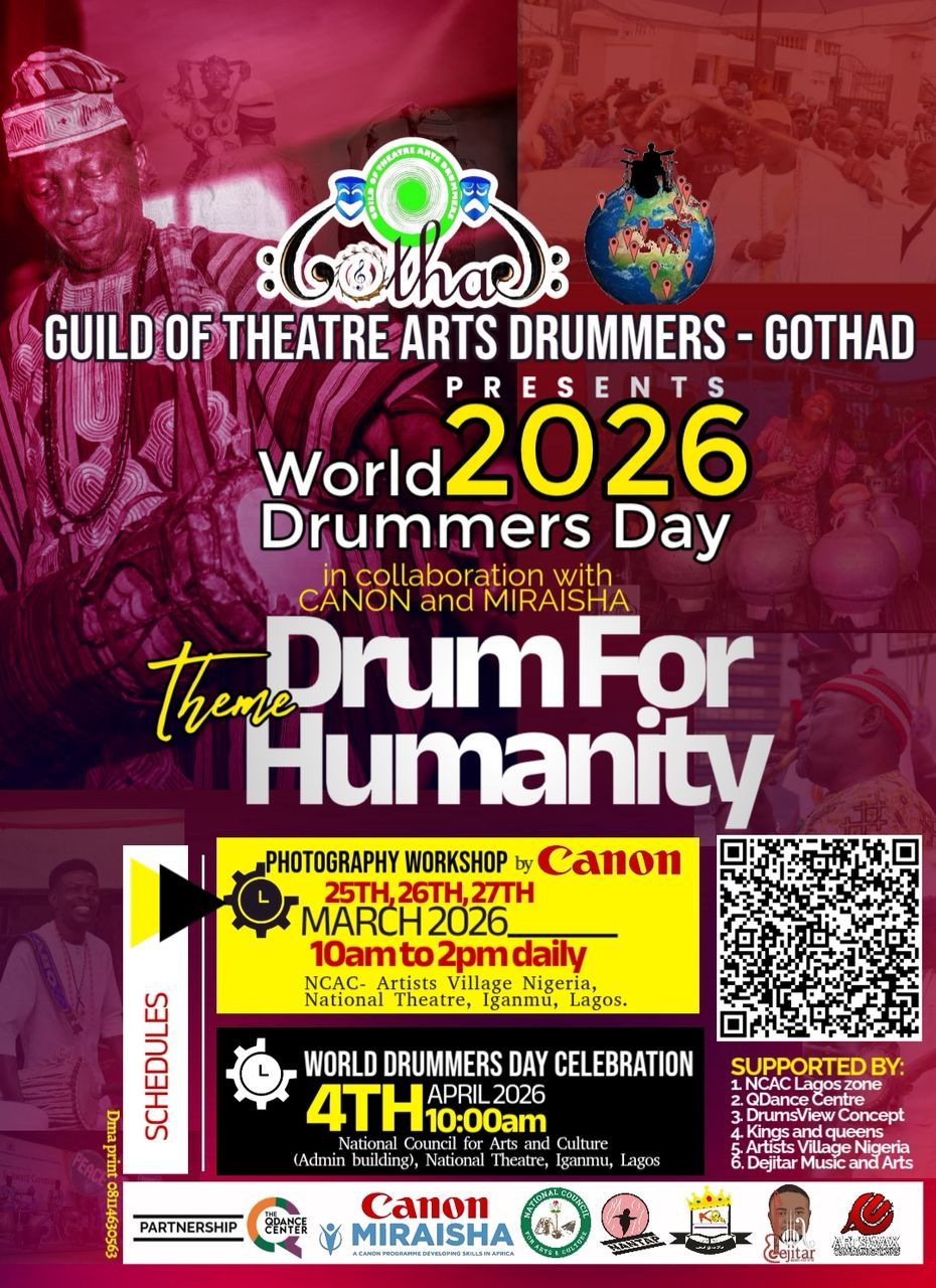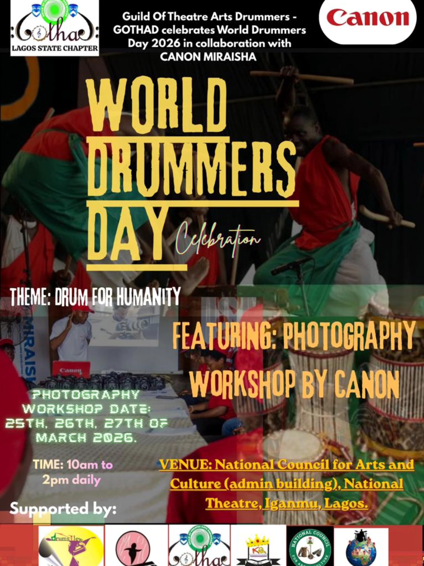 We planning to have a three day photography workshop with CANON before the world Drummers Day celebration. The workshop will still be focused on drums because the participants will have to take pictures of different drums that will be made available for the practical session and the pictures will be framed and Exhibited on the WDD ceremony alongside with other performances of the day. (Information by GOTHAD NAIJA)